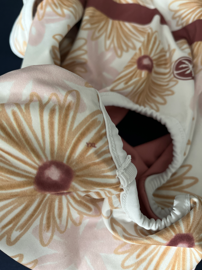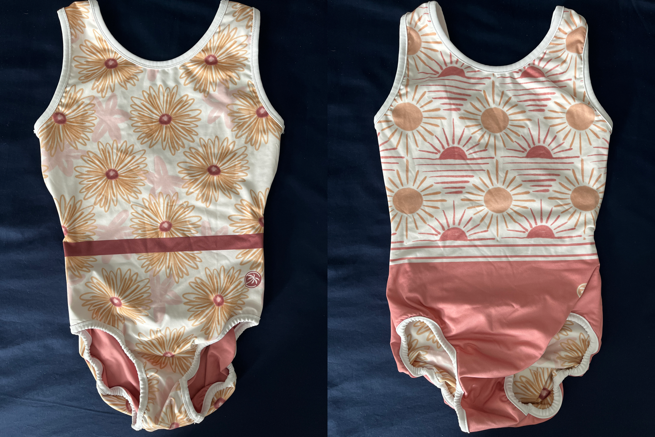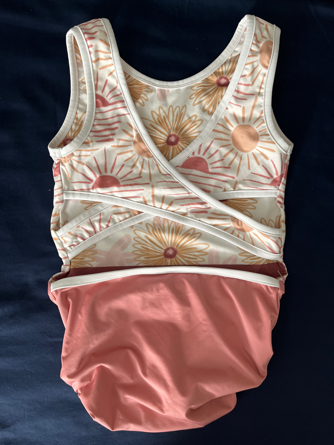 Coco Vida leotard, size YXL – It’s reversible, so there’s two leos in one! One side is white with pink and yellow flowers, and the other is pink and yellow suns. Both have an open cross-cross strappy back. Very pretty on!