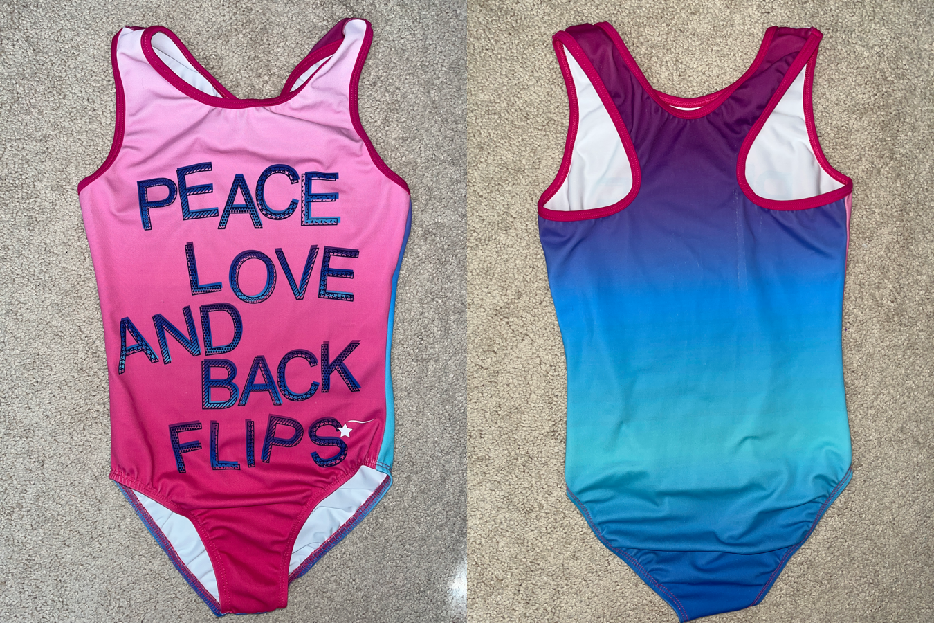 Destira “Peace, Live, and Backflips” child L leotard. Fair condition for a line of snagging on the back. Please see all pictures.