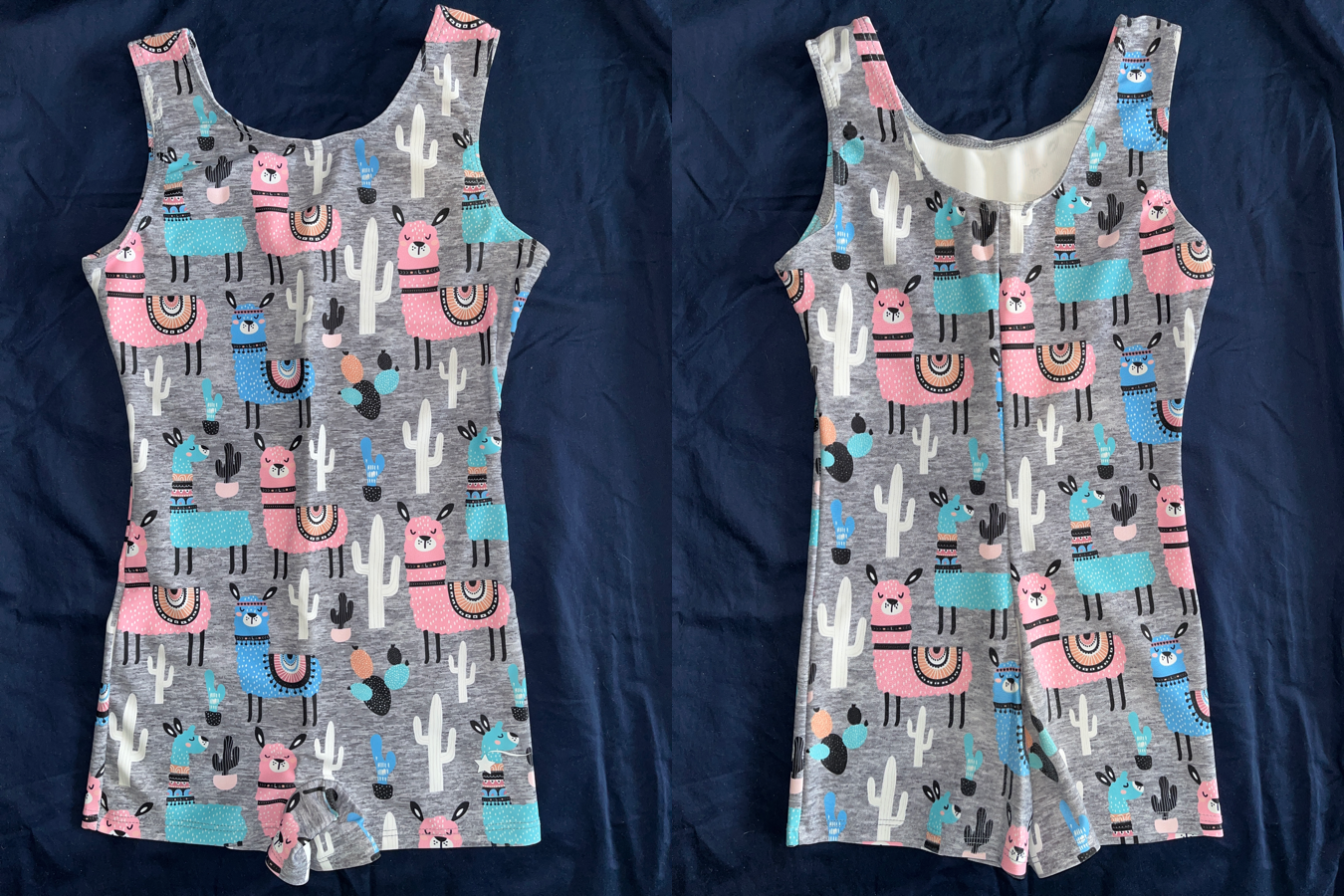 Gray unitard with pink and blue llamas. Destira girls size large, in VGUC.