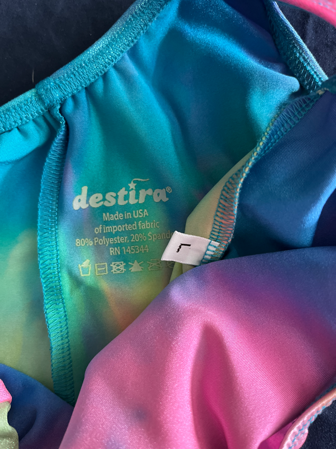 Neon, rainbow tie dye with blue shimmer unitard. Destira size child large.