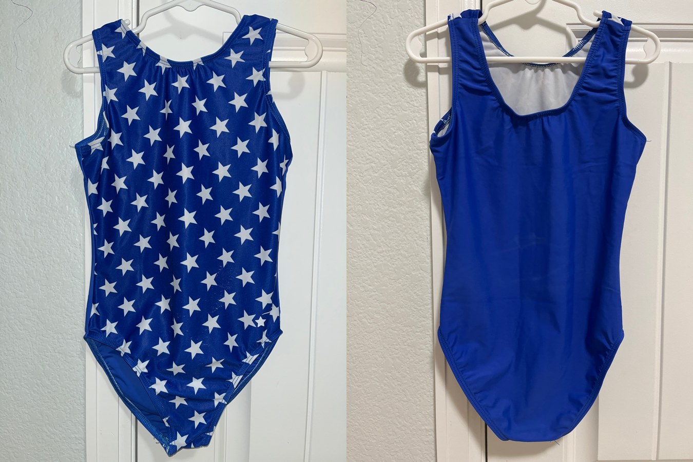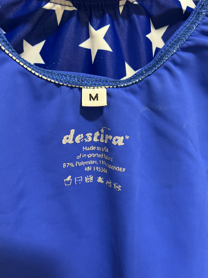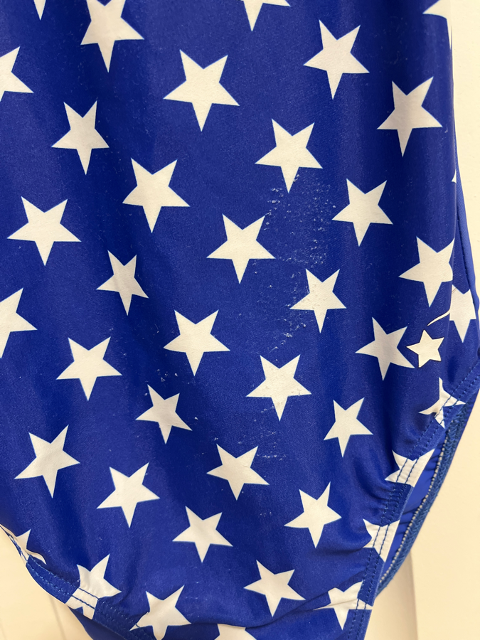 Cute blue leotard with white stars, perfect for Fourth of July! It’s only listed as fair condition because of a patch of pilling on the stomach – please see pictures 🙂