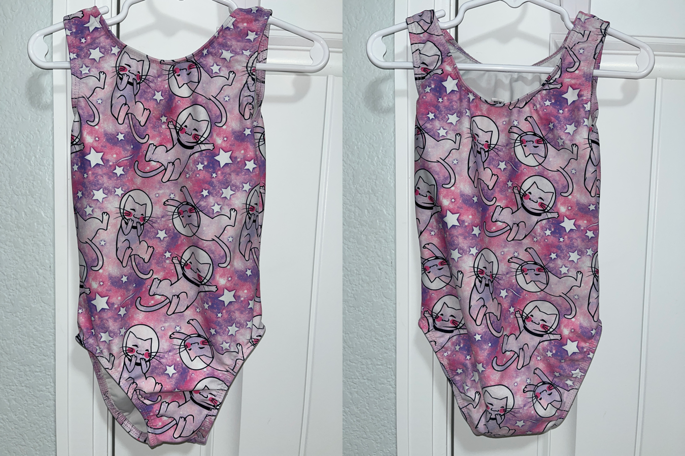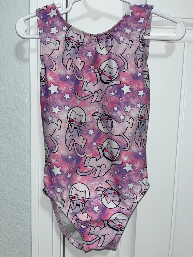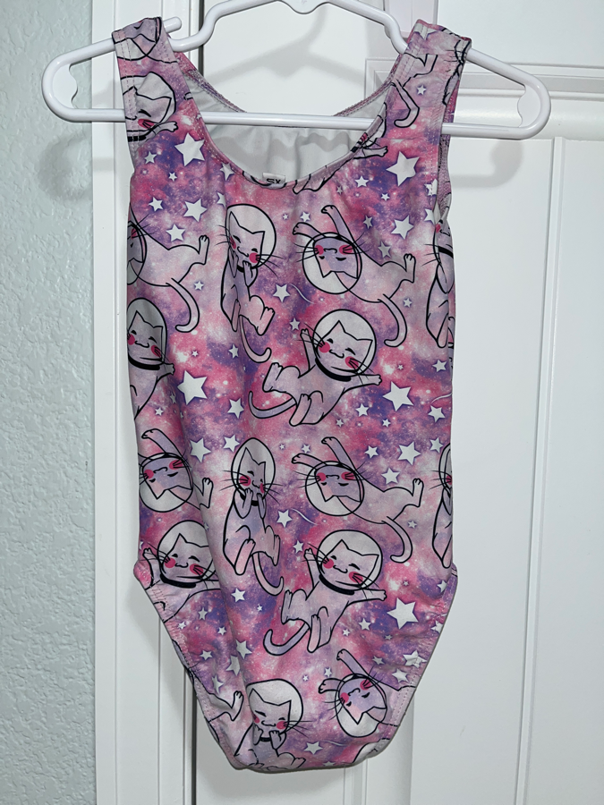 Cute, pink Destira leotard with space kitties. Child size XS. It’s in good used condition, with just some minor rubbing on the butt from sitting on mats.