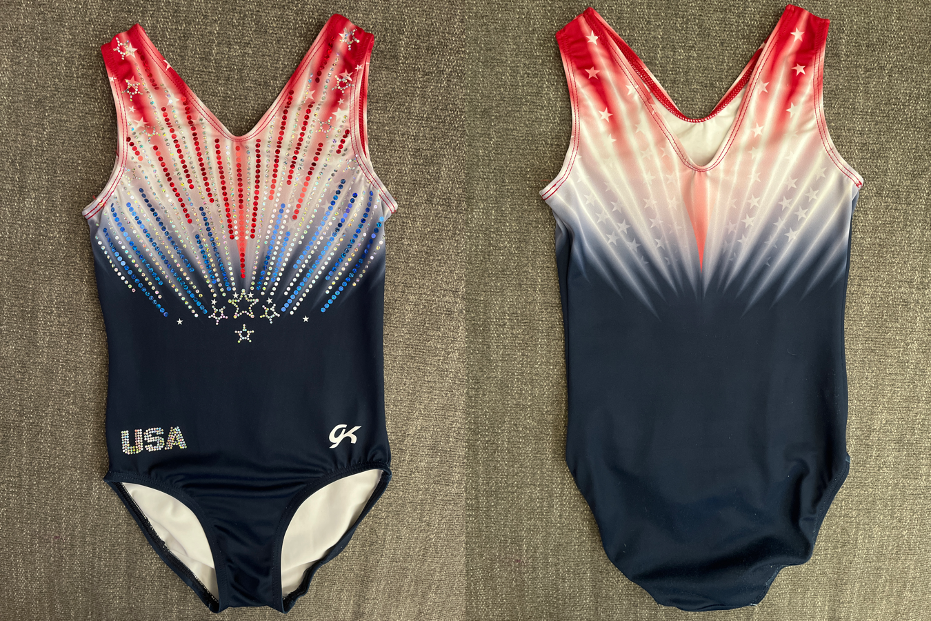 GK 2020 Olympics replica leotard. It’s a size CM in good condition – there is some rubbing on the butt.