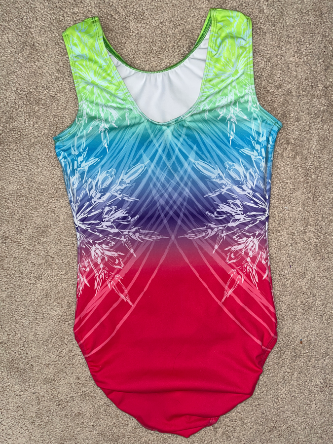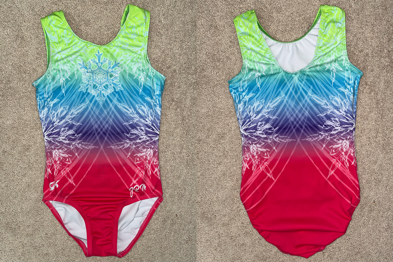 Bright rainbow ombré GK leotard with large snowflakes. The size tag is missing, but it measures the same as our other GK AXS’s. Note it does have JRM on the hip.