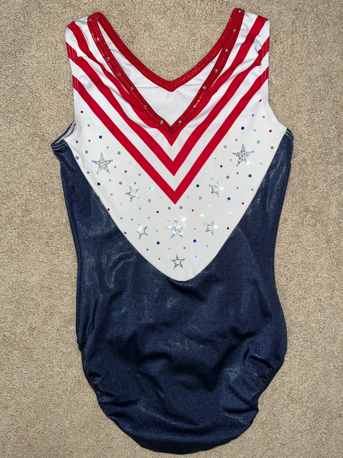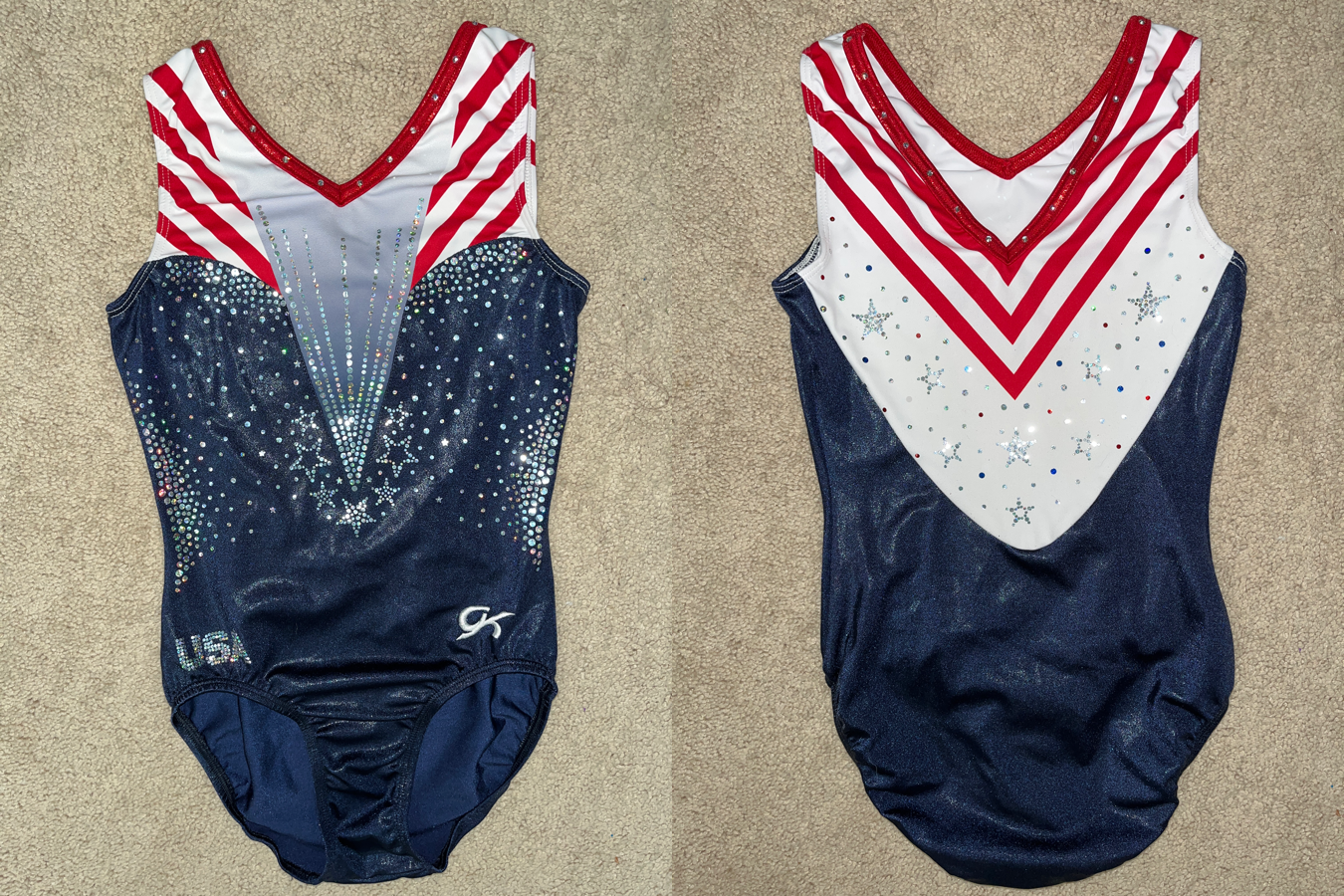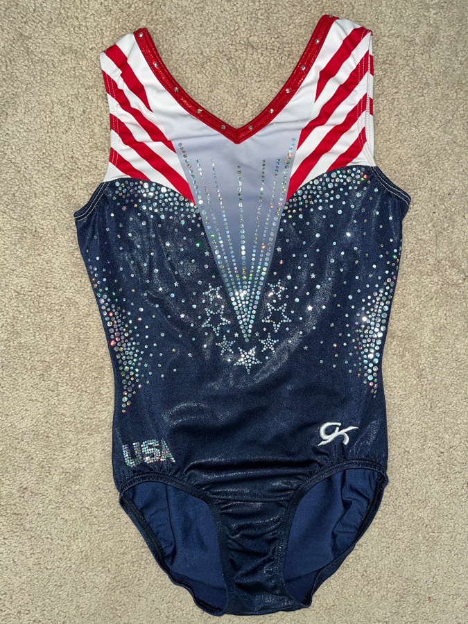 GK replica of the 2020 USA Olympics leotard. Very good condition, just one sequin missing on in the back. It doesn’t have a size tag, but I believe it’s an AXS.