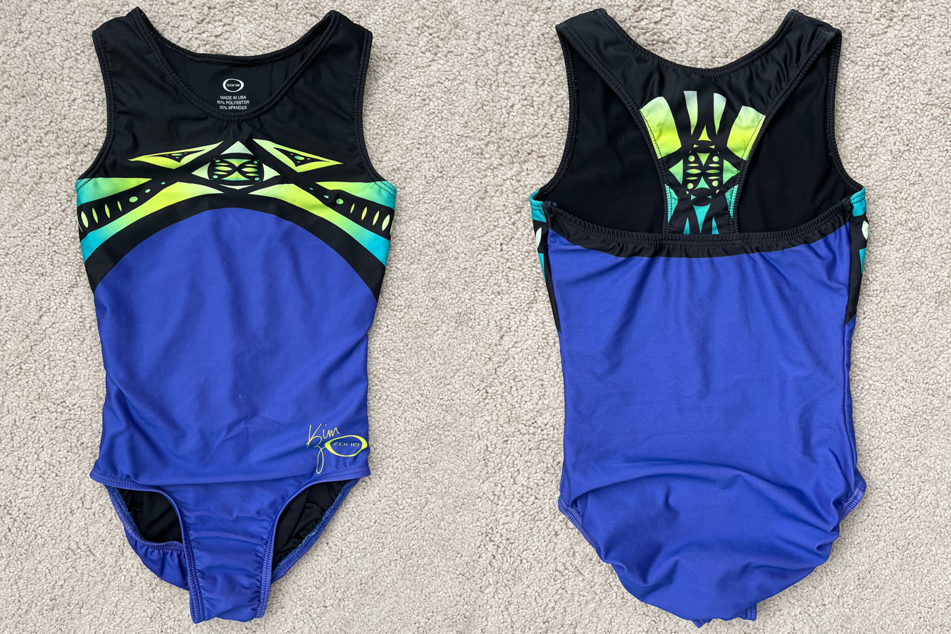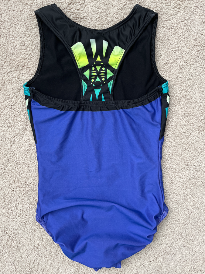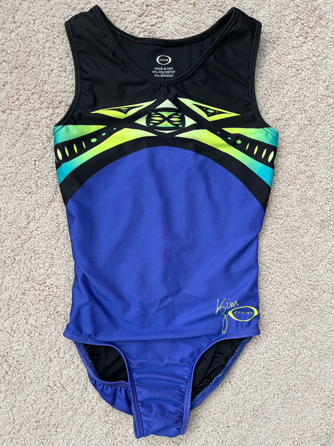 Cute purple, black, and neon Kim Zmeskal x Ozone leotard, size AXS. It’s listed as VGUC but there is one pill on the lower stomach.