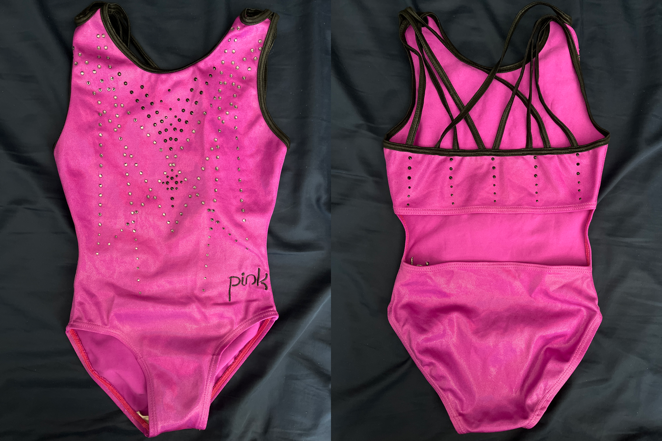 Shiny purple Pink Leisurewear leotard with black and silver crystals and open / strappy back. I believe it’s a size large but it no longer has a tag (fits like our other GK CL’s). **the last picture (more purple one) is the best representation of the actual color**