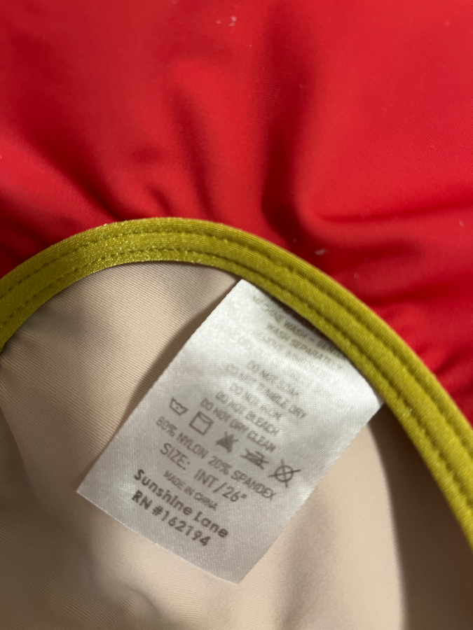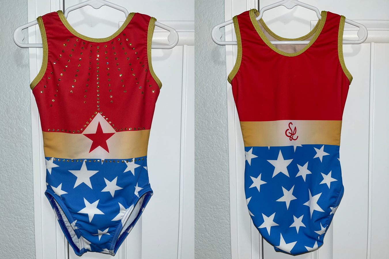 Sunshine Lane Wonder Woman leotard, size INT (between a child S and M). Very good condition because there’s a few small scattered pricks.