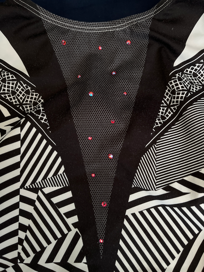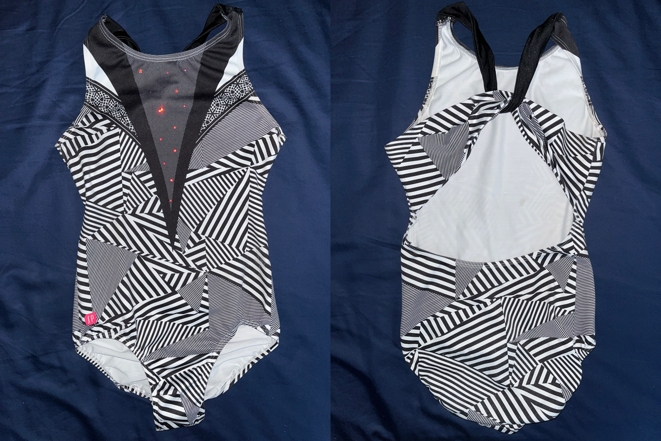Older white and black SP leotard, size 10. Only good condition because of minor wash wear and some fuzziness to the fabric.