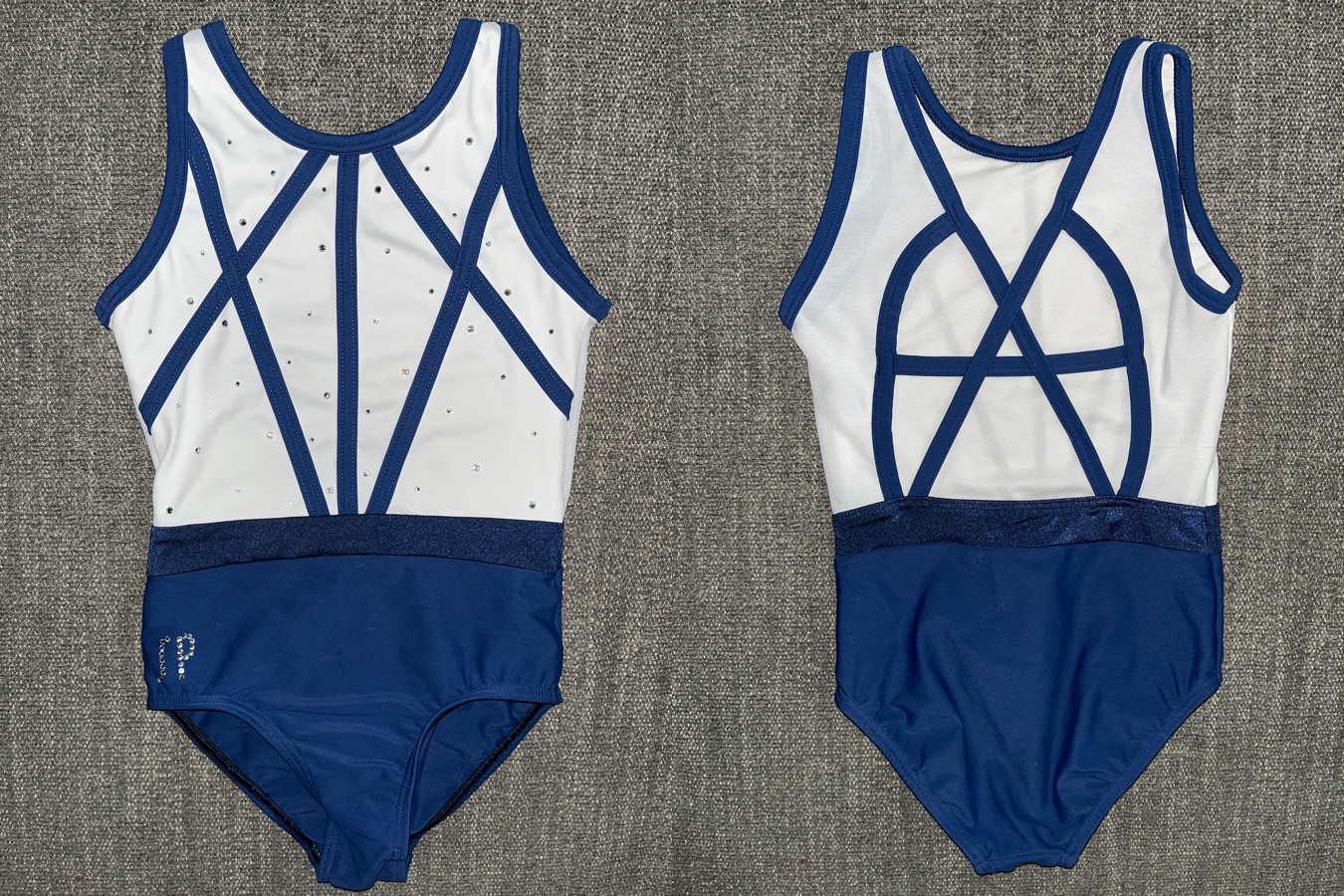 Beautiful navy and white SP leotard with crystals and mesh back. Good condition because of some small pricks and very minor rubbing.