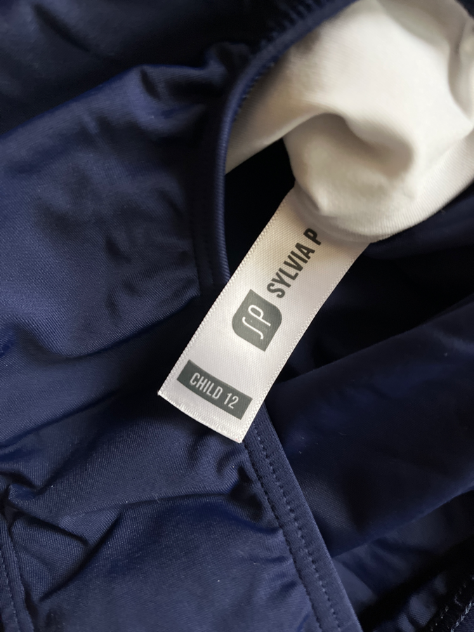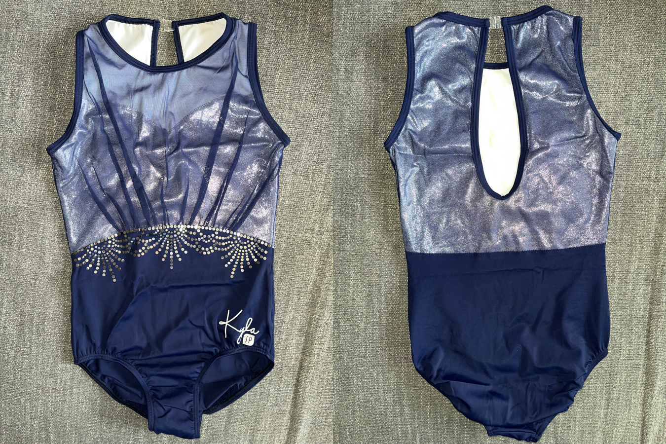 Elegant navy blue mesh over silver top with silver spangles and a navy bottom. Sylvia P and Kyla Ross collaboration leotard, size 12.