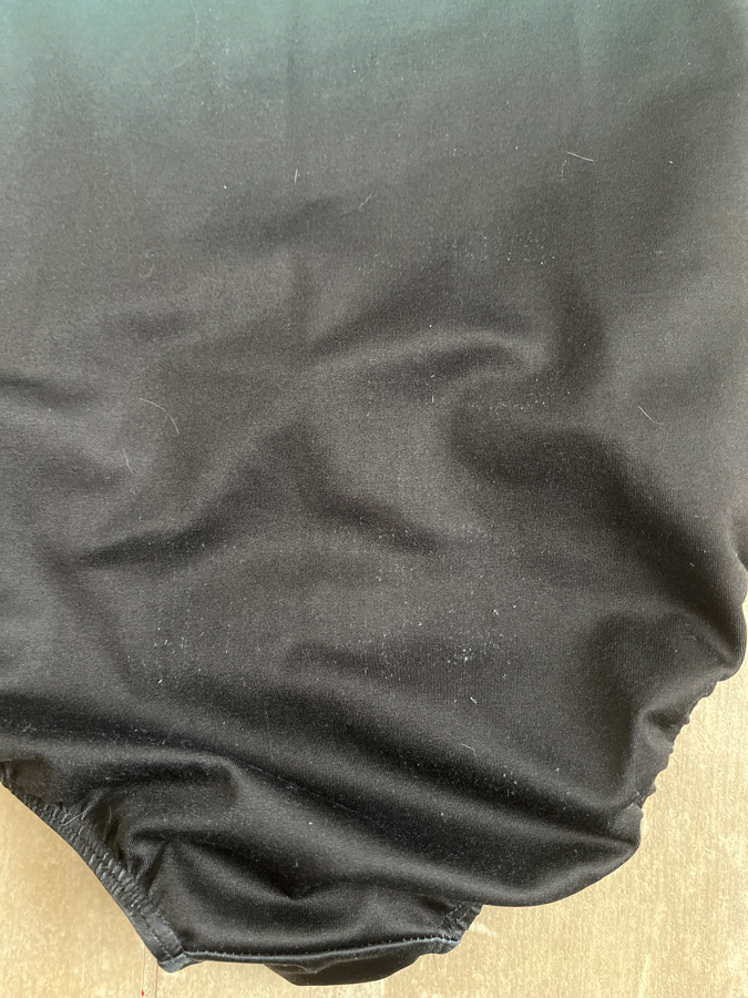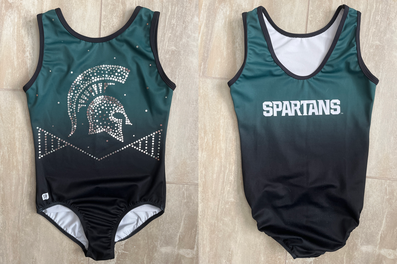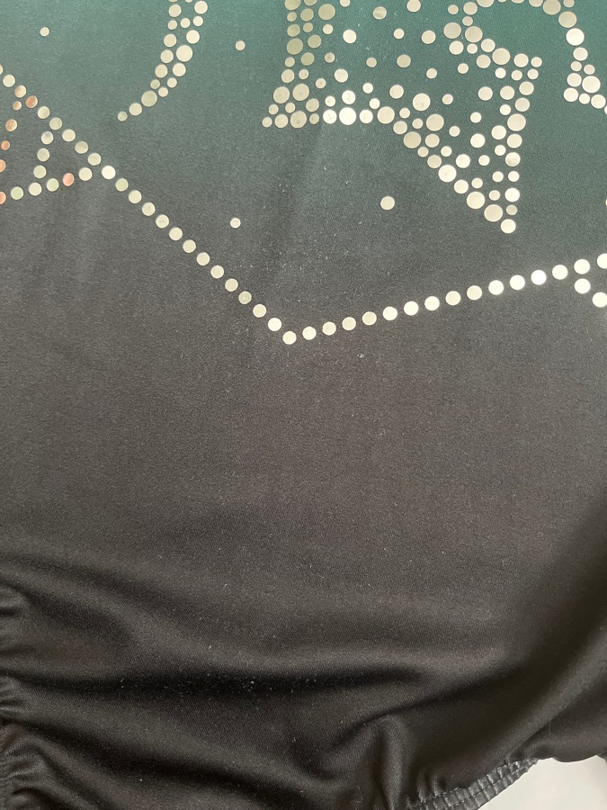 SP Michigan Spartans leotard, size 12. Good condition for some rubbing on the lower stomach, and pricks on the bum (but I think it looks worse in the pictures than in person). I don’t see any missing spangles.