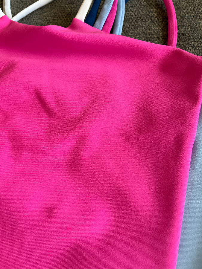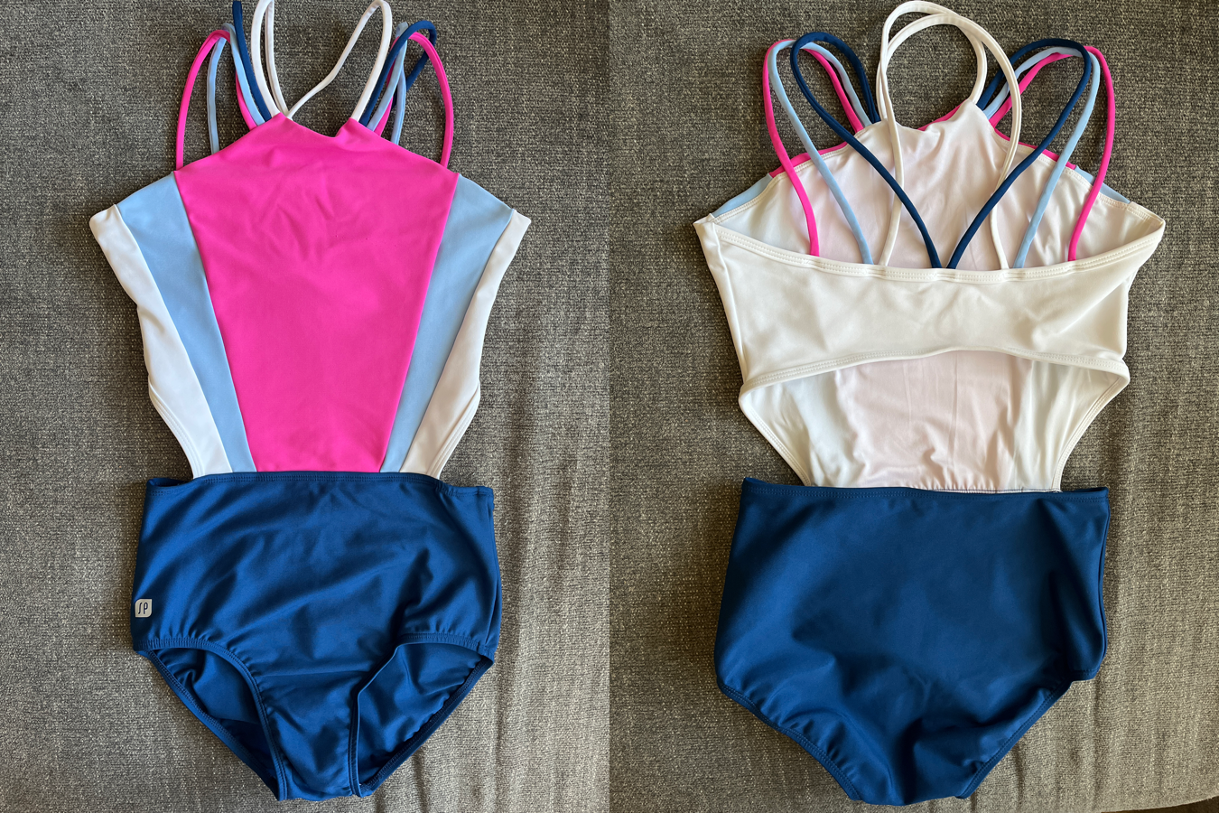 Pink and blue Sylvia P “Fenway” leotard, size AXS. It’s in VGUC, the only sign of wear I see are a couple tiny pills on the chest (pictured).