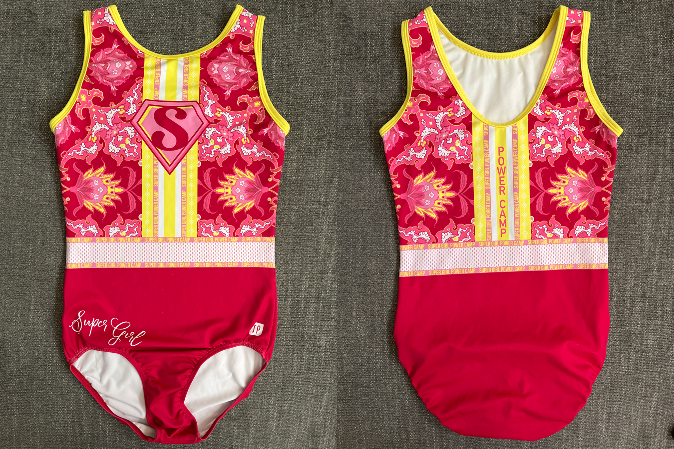 Cute pink and yellow Super Girl leotard, size AXS. It’s in good used condition – there’s a small amount of fuzziness on the bum and some small pilling on the lower stomach.